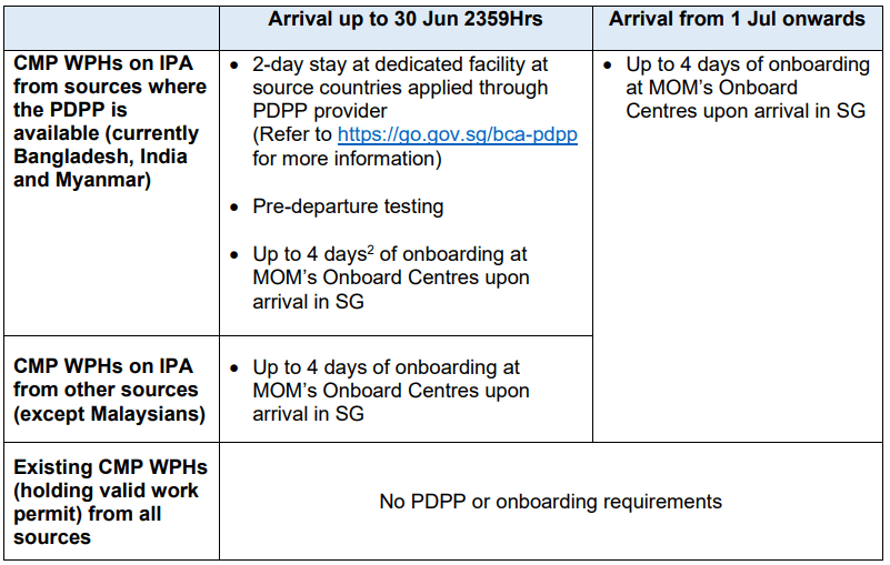 3. Notwithstanding the phasing out of PDPP requirements, all non-Malaysian male WPHs from the CMP sectors holding an IPA will still be required to undergo the residential onboarding programme at the MOM’s Onboard Centres upon their arrival in Singapore. Employers whose WPHs are required to undergo the Onboard programme must ensure that they have booked a